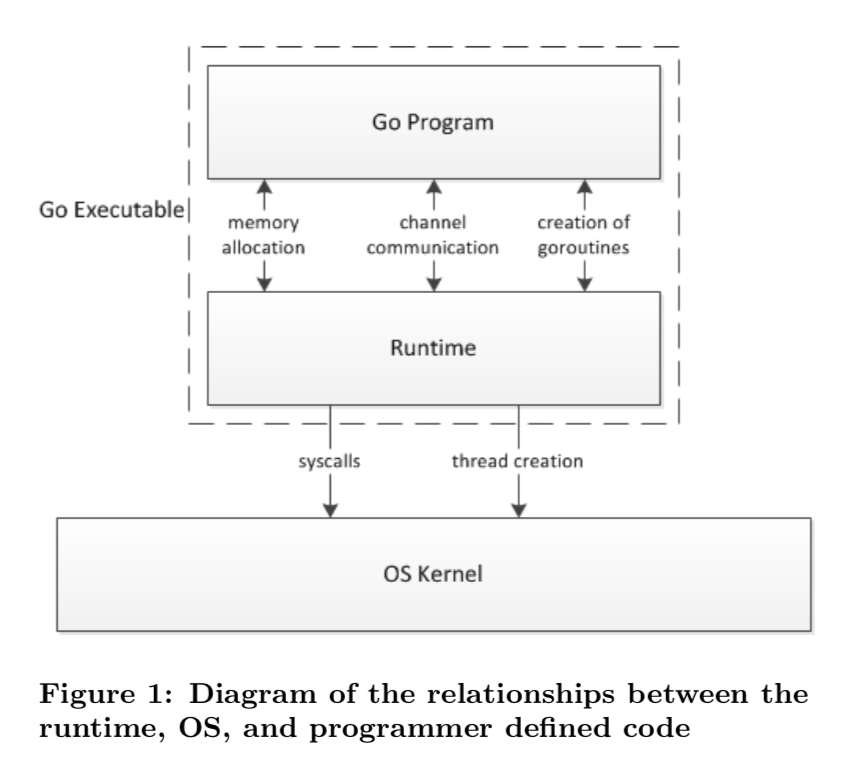 Go 程序的执行由两层组成:Go Program,Runtime,即用户程序和运行时。它们之间通过函数调用来实现内存管理、channel 通信、goroutines 创建等功能。用户程序进行的系统调用都会被 Runtime 拦截,以此来帮助它进行调度以及垃圾回收相关的工作。