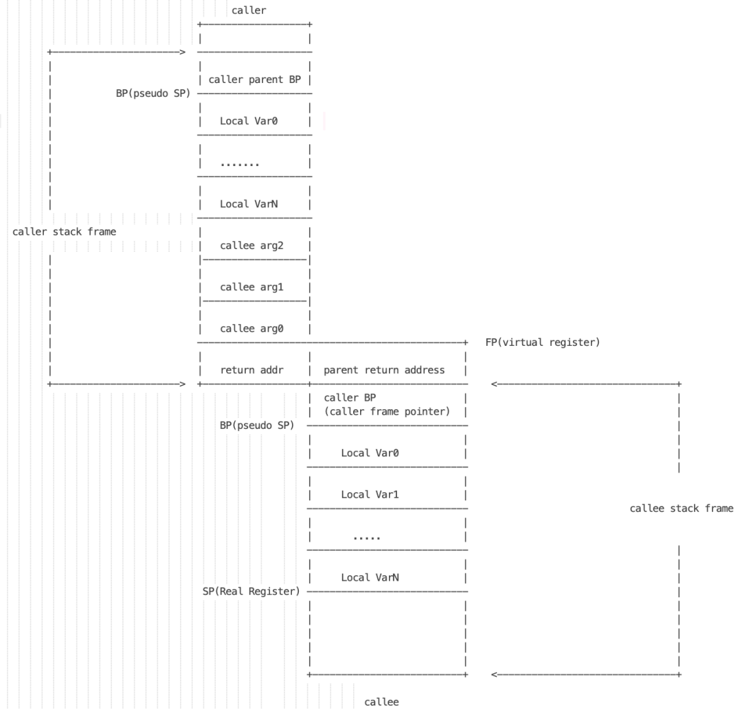 然后,就会进入被调用者的栈帧。首先会将 caller BP 压栈,这表示栈基址,也就是栈底。栈顶和栈基址定义函数的栈帧。
