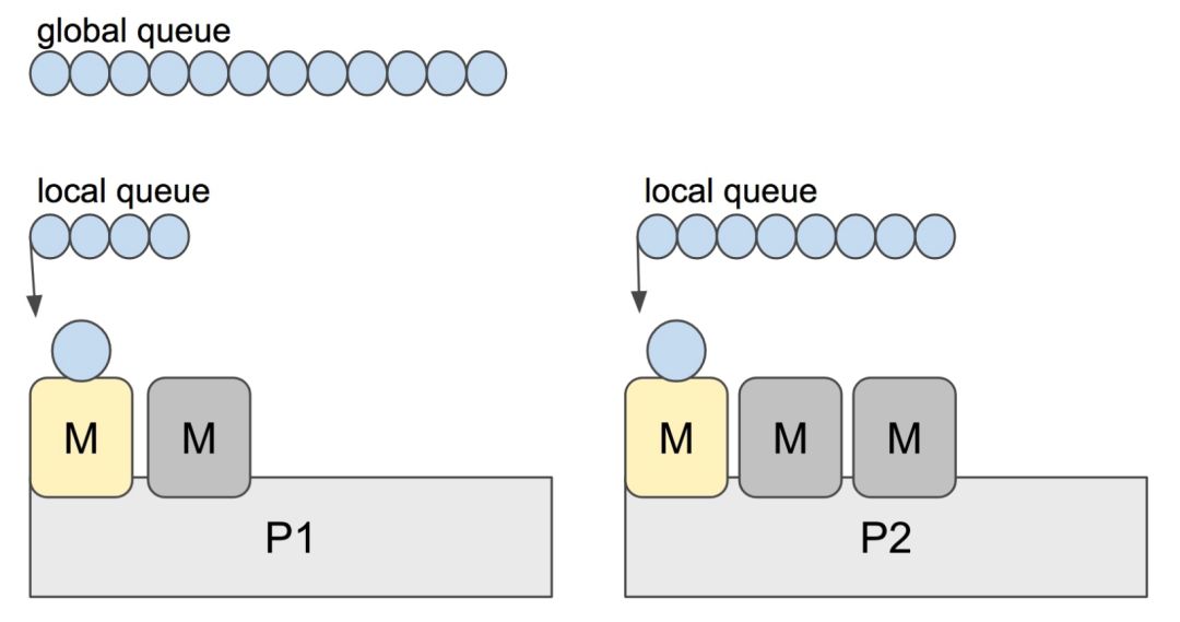 - 线程私有的 runqueues,并且可以从其他线程 stealing goroutine 来运行,线程阻塞后,可以将 runqueues 传递给其他线程。