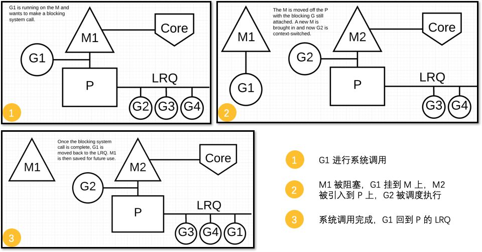 | 系统调用 | 当 goroutine 进行系统调用时,会阻塞 M,所以它会被调度走,同时一个新的 goroutine 会被调度上来 |