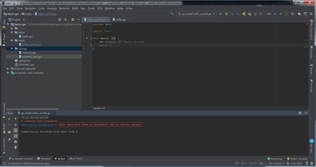 main函数,不支持返回值,若此时强行运行main方法,则会报错:func main must havenoargumentsandnoreturnvalues