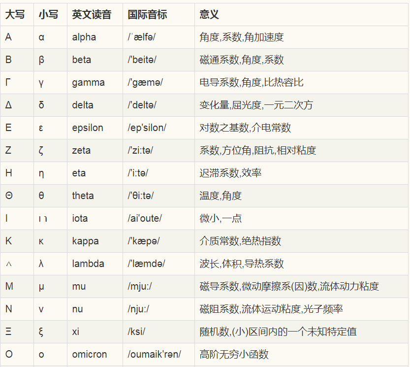 希腊字母常常用于物理,化学,生物,科学等学科,作为常量或者变量,不同于一般的英语变量或常量的是,希腊字母表示的变量或常量一般具有特定的语义!
