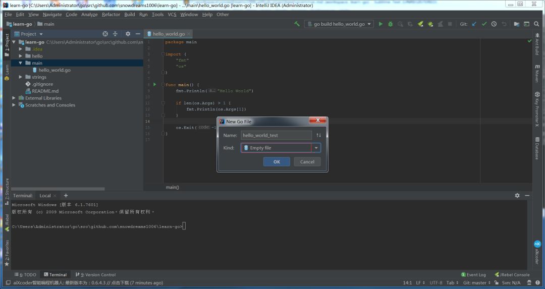 新建 Go 文件,类型选择 EmptyFile ,文件名命名为 hello_world_test ,编辑器新建一个空白的测试文件.