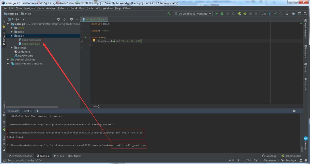 go run 命令直接运行,而 go build 命令产生可执行文件,两种方式都能如愿以偿输出 HelloWorld .