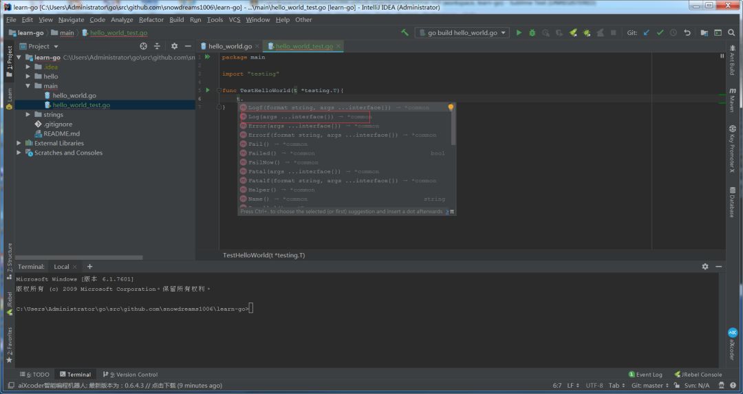 此时编写测试方法签名,利用编辑器自动提示功能输入 t.Log 随便输出些内容,这样就完成了第一个测试文件.