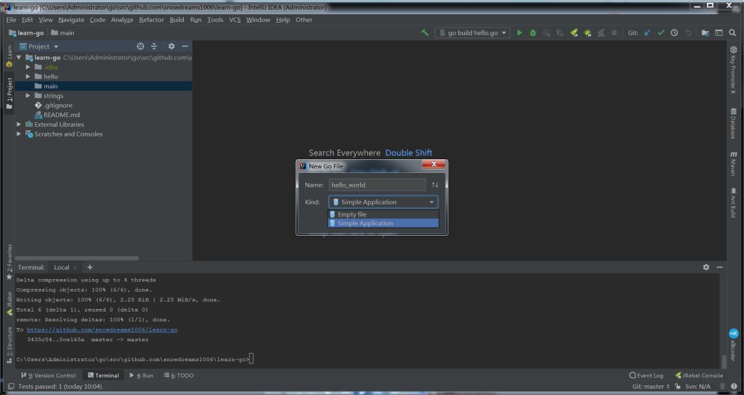 新建 main 目录,并新建 hello_world.go 文件,其中文件类型选择 SimpleApplication ,编辑器会帮助我们创建 Go 程序骨架.