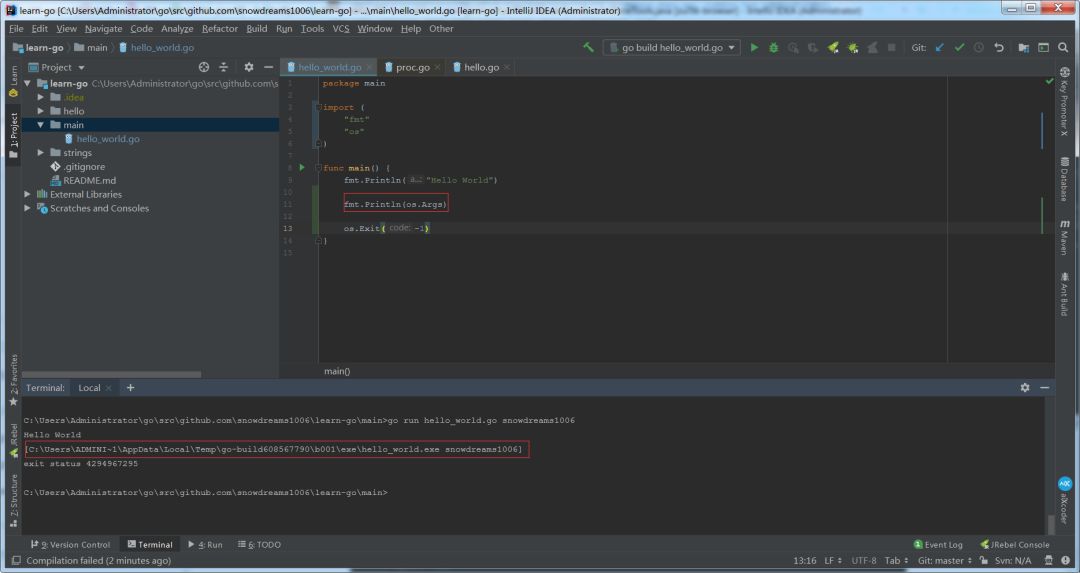 Terminal终端选项卡中运行go run hello_world.go snowdreams1006命令os.Args输出命令路径和参数值.
