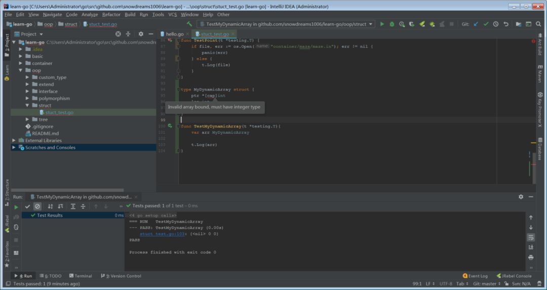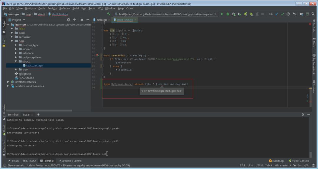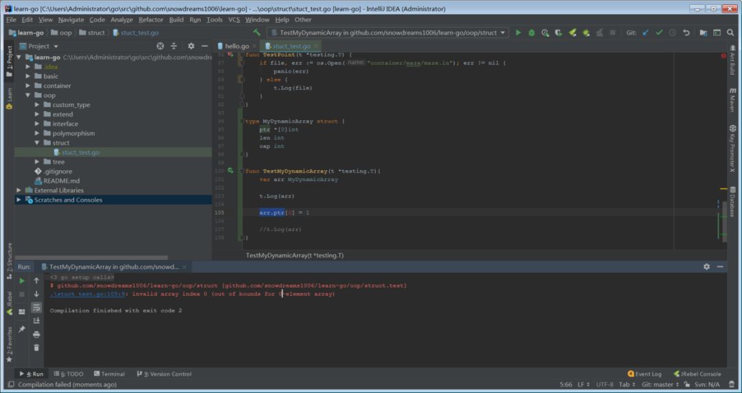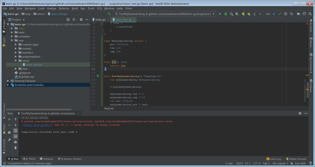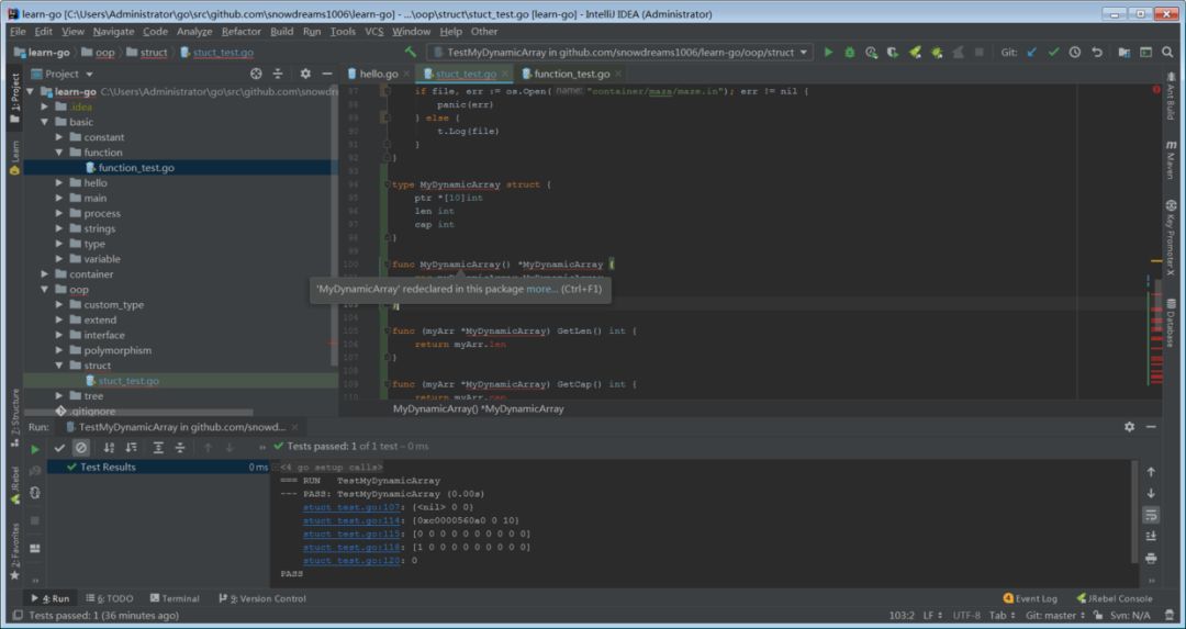 尝试按照其他主流的编程语言中构造函数的写法来编写 Go 的构造函数 , 没想到 Go 编译器直接报错了,提示重新定义了 MyDynamicArray 类型,以至于影响了其余部分!