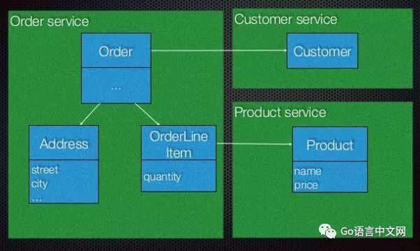 让我们用具体的例子来看一下。在下面的例子中,有三个微服务,“Order Service”, “Customer Service” 和“Product Service”.