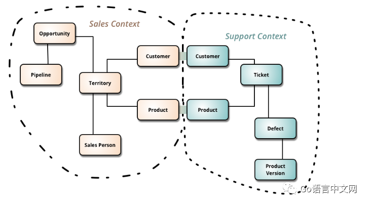 这是一种具有颠覆性质的的设计,它把系统中所有的数据都以事件(Event)的方式记录下来,它的持久存储叫Event Store, 一般是建立在数据库或消息队列(例如Kafka)基础之上,并提供了对事件进行操作的接口,例如事件的读写和查询。事件溯源是由领域驱动设计(Domain-Driven Design[4])提出来的。DDD中有一个很重要的概念,有界上下文(Bounded Context[5]),可以用有界上下文来划分微服务,每个有界上下文都可以是一个微服务。下面是有界上下文的示例。下图中有两个服务“Sales”和“Support”。有界上下文的一个关键是如何处理共享成员, 在图中是“Customer”和“Product”。在不同的有界上下文中,共享成员的含义、用法以及他们的对象属性都会有些不同,DDD建议这些共享成员在各自的有界上下文中都分别建自己的类(包括数据库表),而不是共享。可以通过数据同步的手段来保持数据的一致性。下面还会详细讲解。