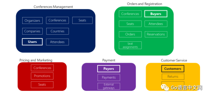 用这张图做例子。这个图里的每个圆角方块大致是一个微服务,但我们可以把它作为一个单体程序来设计,内部有五个微服务。每个模块都有自己的数据库表,它们都在一个数据库中,但模块之间不能跨数据库访问(不要建立模块之间数据库表的外键)。“User”(在Conference Management模块中)是一个共享的类,但在不同的模块中的名字不同,含义和用法也不同,成员也不一样(例如,在“Customer Service”里叫“Customer”)。DDD(Domain-Driven Design)建议不要共享这个类,而是在每一个有界上下文(模块)中都建一个新类,并拥有新的名字。虽然它们的数据库中的数据应该大致相同,但DDD建议每一个有界上下文中都建一个新表,它们之间再进行数据同步。