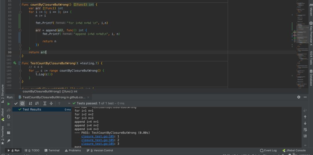当我们运行 countByClosureButWrong 函数获得闭包返回的函数数组 arr,然后通过 range 关键字进行遍历数组,得到正在遍历的函数项 c.