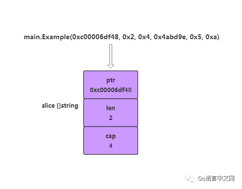 显示了0xc00006df48代表第一个参数[]string 的指针,0x2代表 slice 长度,0x4代表容量。这三个值代表第一个参数。