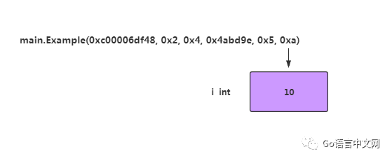 显示堆栈中的最后一个参数就是 Example 声明中的第三个参数,它的值是0xa,也就是整数 10。