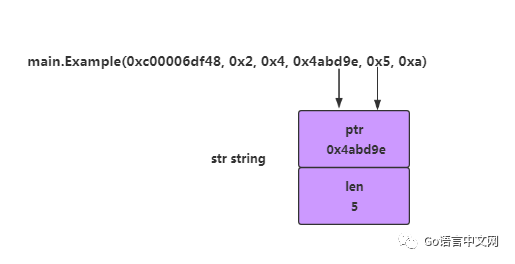 显示堆栈跟踪信息中的第 4 个和第 5 个参数代表字符串的参数。0x4abd9e是指向这个字符串底层数组的指针,0x5是"hello"字符串的长度,他们俩作为第二个参数。