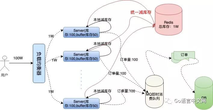 问题接踵而至,在高并发情况下,现在我们还无法保证系统的高可用,假如这 100 台服务器上有两三台机器因为扛不住并发的流量或者其他的原因宕机了。那么这些服务器上的订单就卖不出去了,这就造成了订单的少卖。要解决这个问题,我们需要对总订单量做统一的管理,这就是接下来的容错方案。服务器不仅要在本地减库存,另外要远程统一减库存。有了远程统一减库存的操作,我们就可以根据机器负载情况,为每台机器分配一些多余的“buffer 库存”用来防止机器中有机器宕机的情况。我们结合下面架构图具体分析一下: