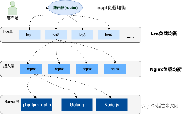 上图中描述了用户请求到服务器经历了三层的负载均衡,下边分别简单介绍一下这三种负载均衡:
