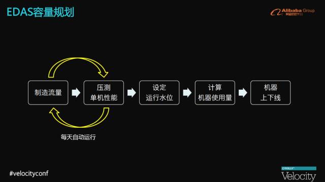 在过去的6~7年时间,沉淀了一整套的容量规划模型。首先我们希望在第一步将线上真实流量进行引流,通过真实流量压测部分单机性能,然后根据设定的运行水位计算系统承载的最高容量,从而到最后可以实现机器按需的上线和下线,把这些系统融会贯通在一起,就是整体的容量规划提供的功能。所有的压测在单机上都会定一些指标,当我们进行集群中把一半机器流量全部引到另一半时候,所有流量的QPS就会翻倍,当单机性能如果没有达到运行水位时,就会继续引流,直到达到指标为止。