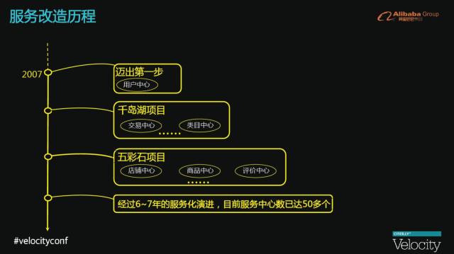 淘宝网围绕EDAS技术体系进行了一整套的服务化改造,在这个改造过程中,我们首先将数据复用度最高的数据进行拆分,剥离出用户中心这样的共享型的服务层,对上层所有业务进行用户相关的所有逻辑,接下来又陆续有千岛湖项目、五彩石项目,这些项目的背后都是一系列的服务化中心拆分出来的产物,后来经过6~7年的服务化演进,目前服务中心数已达50多个。