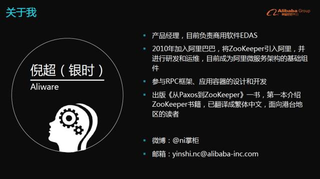 演讲者倪超,阿里花名银时,阿里巴巴企业互联网架构平台产品专家、国家认证系统分析师、IT畅销书作者,著有《从Paxos到ZooKeeper》一书,2015年国内新书畅销榜Top10。2010年,以实习生身份加入阿里,入职中间件技术团队,经历了阿里中间件技术从1.0到3.0的变革,目前负责商用软件EDAS。