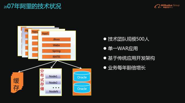 在2007年的时候,阿里技术团队规模大概是500人左右,当时的主要业务站点淘宝网,都在一个单一的WAR包进行部署,基于传统JAVA EE应用开发架构,使用的是Oracle数据库和JBoss服务器——而与此同时,淘宝网的业务每年翻倍增长。