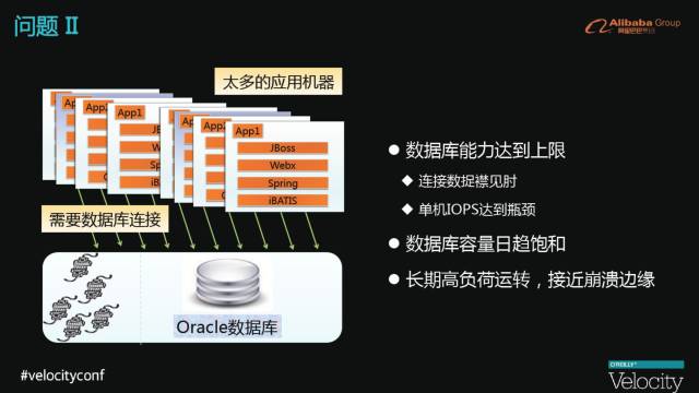 第二个挑战,是数据库能力达到上限。淘宝早期用Oracle数据库,单机的Oracle数据库连接数捉襟见肘、单机IOPS达到瓶颈、CPU 90%以上,每年Down机最少一次。