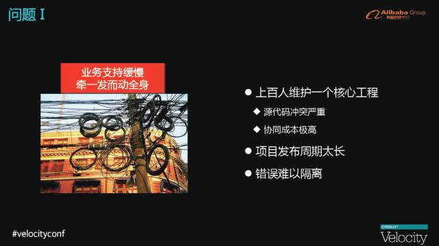 在那个阶段,我们面临着非常多的挑战:第一个挑战,是系统的研发成本非常高。上百人维护一个核心工程会碰到很多问题,包括源代码冲突严重、协同成本非常高等;同时,项目发布周期太长;所有的逻辑都是耦合的,错误难以隔离,如对淘宝网整个工程里的某个模块、某个系统功能进行一些改动时,整个系统都会面临非常大的技术风险。