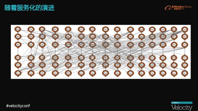 随着服务化的拆分,所有的系统会变得越来越多,箭头指向就是底层的服务化中心,上层调用过来就是前端的业务系统。很多系统调用很多的服务中心,这时已经没有能够人为的架构师帮助我们进行服务依赖和架构梳理。