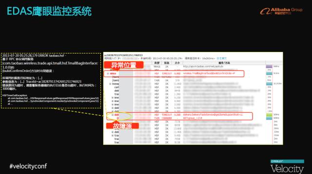 于是,阿里内部进行了EDAS鹰眼的研发。图中从上至下,包括从页面打开到页面完整响应所经历的分布式各层系统调用。阿里内部就是依靠一整套的链路跟踪系统,能够在系统出现打开失败时,可以非常清晰的故障根源在哪。
