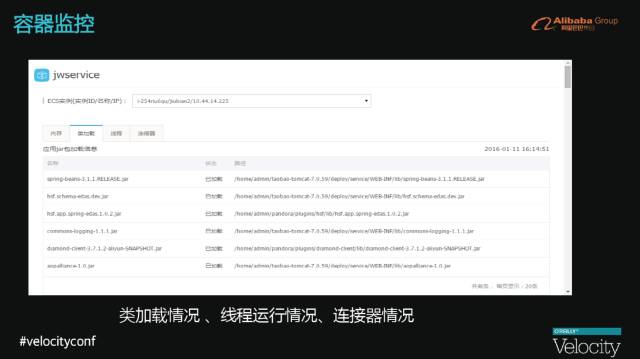 阿里巴巴目前是架构在Java平台上,作为包含Java运行环境的Java容器,是监控的重点,我们会监控堆内存与非堆内存使用情况、线程运行情况(提前将线程情况全部显示出来)、连接器情况,类加载情况尤复杂,很多时候一个类进行初始化时,层层依赖其它类,对此,我们在应用启动时跟踪加载的类。