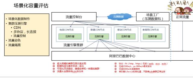 当年就有这么一个业务,就是采用了整个一种类似于小环境的流量去验证,导致他的入口的交换机的整个流量跑满。所以说我们需要有一个更加强大的性能评估工具。这就是基于场景化的容量压测,在2013年之后我们全部基于这套体系在做。做场景话容量压测,第一个就是要造数据,因为它的流量全部是造出来的,造出来的场景是需要有一个接近度,我们希望能够更接近真实的情况。刚才讲的临近峰值你是没办法做决策的,你惟一能做的就是提前模拟一次峰值。我们把整个流量模拟出来,在这样的流量压力下你的集群能够表现出什么样子,这是一个理想的架构,但它也有很多困难的地方。我们尽可能把数据造得精确,各种场景都要模拟出来,购物车里面的商品比例是多少,一次下单有多少商品,最后多少商品提交到支付宝,这些场景都要模拟出来。这个造出来的数据量这几年越来越大,以2015年为例,这个数据量接近一个T,我们把这一个T的数据传到我们的中心,通过中心传到我们的压测集群上面去,它可以产生非常巨大的流量,这个流量可以和双11一模一样的,之后再传到CDN的节点上面,产生巨大的流量。