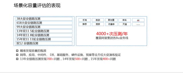 从2013年开始,我们通过这套技术发现了大量的问题,而这些问题你在使用普通测试,比如日常测试,功能测试,或者一些工具测试,你是没办法发现这些问题的。这些硬件的、网络的、操作系统的,从来没有发生过的各种诡异问题,在大负载情况下都会被发现。如果一个问题在双11的时候发生,可能就是灾难性的。13年的时候,我们在做完这些事情之后,回头看12年、11年,这几年不出问题才怪,肯定百分之百出问题。凡是这种峰值流量是你平时流量多少倍以上的活动肯定会出问题,因为很多的问题是没办法通过一些逻辑,通过一些思考你把它给找出来的,它必须借助一个真实的环境,模拟出所有场景的流量把它给引出来,只有这样才能够做到。