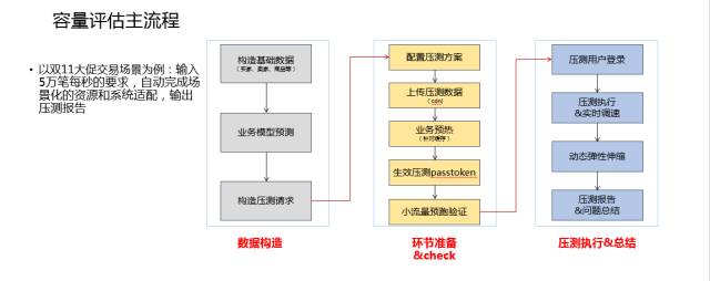 整个容量评估的流程,我们有一个指挥部,我们要做一次活动,我们在系统里面输入一个数值,比如说这次活动我们大概要实现5万笔每秒的交易量,我们输入5万笔每秒这个数字之后,整套系统开始运作,开始做压测,开始做弹性调度,然后做隔离,然后去压测,最后就是把整个环境做好,就是5万笔每秒的环境就还给你了,这就是整个自动化的过程。