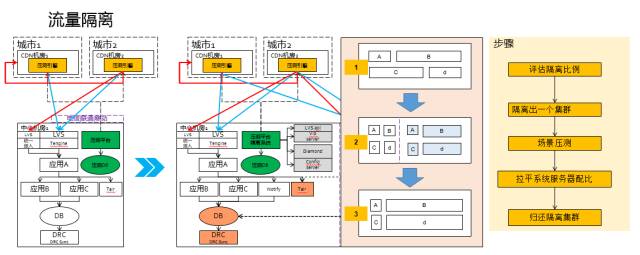 第四点还要做流量的隔离,在没有流量隔离之前,当时我们怎么做呢?我们只能凌晨做,零点以后流量很低的时候,我们坐满人,有人说开始,然后整个流量就起来了,所有的人都盯着自己的系统,看有没有出现什么问题,所以当时大家都非常辛苦。第二年大家提了一个目标,能不能改善一下大家的幸福指数,然后我们就做了一个流量隔离的工作。流量隔离就是快速地通过负载均衡和中间件,从原来在线的集群中隔离出一个无流量的集群出来,当然隔离出来这个集群的规模是非常大的,它可以占比原来的10%到90%都可以。比如原来有10万台服务器,我可以将其中9万台服务器全部隔离成一个集群。因为准备做大促的时候,像双11的流量是平时峰值的20倍以上,所以它的平时流量非常低,你是可以把它给隔离出来的,并且不会影响现有的流量,所以做了一个隔离的系统。整个过程怎么样呢?举的例子,我们ABCD这4个系统,场景1是日常的流量,我们今天要做的活动则会是场景2的情况,我们通过压测之后发现ABCD的流量配比是这样的,原始的场景C所需要的服务器多,但是我们压测出来之后发现,在做活动的时候B和D所需要的服务器比较多。压测出来之后整个过程都是自动化,就是可以你达到多少量的时候,如果是C这个系统不需要这么多的服务器,它的服务器就会被下线,下线之后这些服务器就被自动加到D。这些过程都是自动化运行的,整个效率都非常高,而且不一定要在凌晨才能运行。最后我们把ABCD整个比例压出来之后,得到结果和数据后,所有的资源还是还回去的,把整个隔离出来的集群再还到原来的在线集群,最后变成ABCD这样流量的比例,就是服务器的比例,这样你就可以准备第二天的大考,做这样的大促活动了。