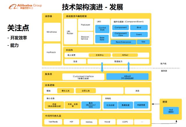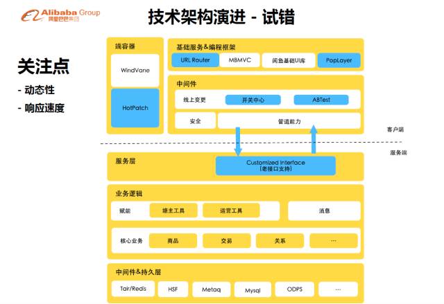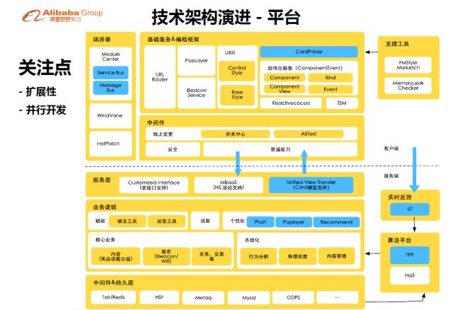 客户端更多的工作是支持更多交互的基础的UI组件和动态适配性。这个过程中我们强调的就是整个的事件驱动的开发模型和整个UI组件库的建立。在服务端因为我们会将大量的一次性工作抛弃了以后,使我们有时间做一些新场景的探索,包括怎样线上跟线下的衔接?这个部分后面会讲到。更多的其实是在数据上的应用,在前面已经说了,其实几亿条商品用户不关心,关心的是几十条和我产生连接的内容。