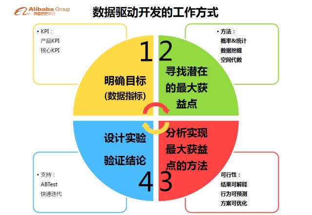 最后给大家说一下数据驱动的开发的工作方式。其实很多同学都会说,我是相信的。但是实际上真正在做事情的时候,可能大家又会按照习惯逻辑说我觉得这样做会更好,这样我们会陷入无休止的纠缠,PD说我觉得怎样,但技术觉得不靠谱,然后就会说我觉得这个不怎样,那个又会说那个怎样。大家都是在说感觉,那么在这种情况下我们到底有什么样的机会可以让我们整个做事的内容能够回归到我们最开始的愿景?对我来说是比较关键的。我们现在的做法是,整个产品KPI,整个核心数据的KPI,它全部指向我自己的关键诉求。