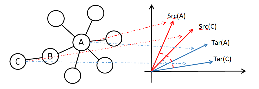 我们的工作所做的改进其实非常简单,首先为了有能力表达非对称性相似度,我们为每个节点引入了两种Embedding向量,分别是Source向量和Target向量,如图一所示。我们将对于A来说B的相似度记为 sim(A,B) ,并使用Source(A)与Target(B)的点积来表示,图一中我们可以从Embedding中算出sim(A,C)<sim(C, A) 。