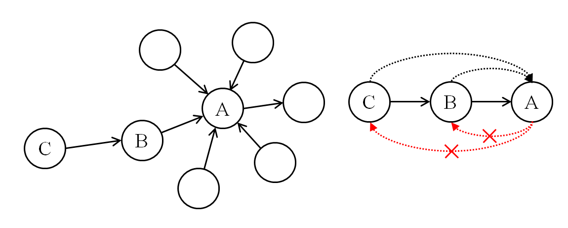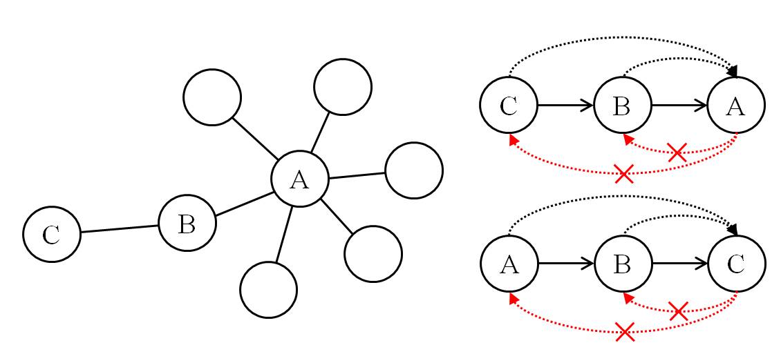 例如在有向图(图1)中,对于A来说,可能并不关心C,而对于C来说,A很可能是他的兴趣点。即使在无向图中(图2),也有同样的现象。这样的节点非对称性关系是由于节点周围的图结构不同造成的。而从C出发的路径C->B->A和从A出发的路径A->B->C有着完全不相同的概率(0.5,0.08)。因此我们不能认为C->B->A这条路径的产生会带来一个(A->C)的正样本。