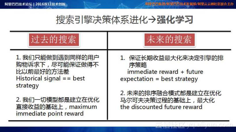 我们的目标是希望搜索引擎决策体系进化为具有强化学习能力的智能化平台。过去的搜索,我们只能做到遇到同样的用户购物诉求下,尽可能保证做得不必以前最好的方法差,也就是所谓的Historical Signal==Best Strategy;一切模型都是建立在优化直接收益的基础上。未来的搜索,我们希望能够保证长期收益最大化来决定引擎的排序策略,也就是Immediate Reward+Future Expectation=Best Strategy;未来的排序融合入模式都是建立在优化马尔科夫决策过的基础上,最大化The Discounted Reward。