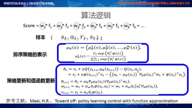 其算法逻辑如上图所示,基本算法是实现线上几十个排序分的有效组合,样本包括日志搜集到的状态空间、Action Space(这里对应的是排序分空间),奖赏是用户有效的Feedback,具体的排序策略表达公式以及策略更新和值函数更新的公式可以参考Maei,HR的《Toward off-policy learning control with function approximation》一文。