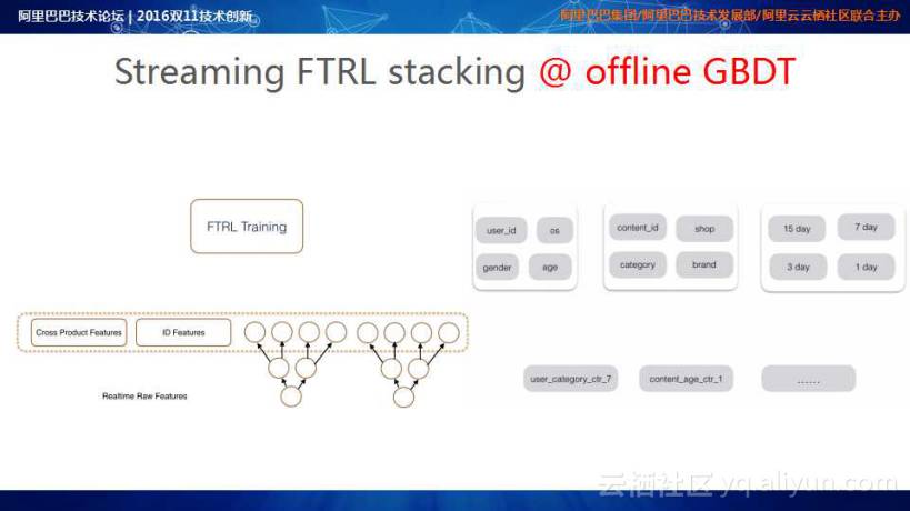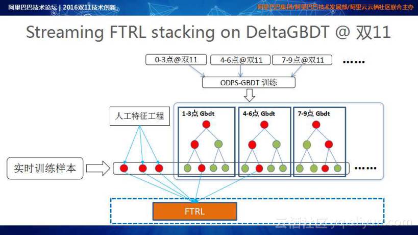 双11当天的成交额是是普通成交日的十到十二倍,点击量将近三十倍。在用户行为密集发生的情况下,有理由相信数据分布在一天内发生了显著的变化,基于这样的考虑,GBDT的Training由原来的日级别升级到小时级别(每小时进行GBDT Training),这些Training的模型部署到Streaming的计算体系中,对于实时引入的训练样本做实时的预测来生成对应的中间节点,这些中间节点和人工的特征一起送入FTRL决出相应特征的重要性。