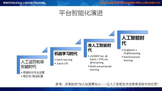 电商搜索和推荐的智能化演进路程可以划分为四个阶段:人工运营和非智能时代、机器学习时代、准人工智能时代、人工智能时代。人工运营和非智能时代,主要靠领域知识人工专业运营,平台的流量投放策略是基于简单的相关性+商品轮播;在机器学习时代,利用积累的大数据分析用户购物意图,最大化消费者在整个链路中可能感兴趣的商品;准人工智能时代,将大数据处理能力从批量处理升级到实时在线处理,有效地消除流量投放时的误区,有效地提高平台流量的探索能力;人工智能时代,平台不仅具有极强的学习能力,也需要具备一定的决策能力,真正地实现流量智能投放。