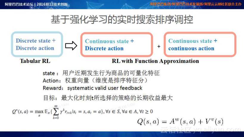 双11采用Q-learning的方式进行实时策略排序的学习,将状态值函数从状态和策略空间将其参数化,映射到状态值函数的参数空间中,在参数空间中利用Policies Gradient进行求解;将状态值函数Q拆解成状态值函数V(s)和优势函数A(s,a)进行表达。