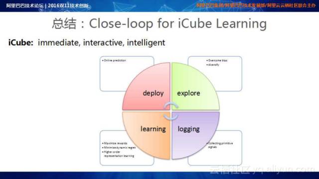 整体搜索/推荐希望建立一个Close-loop for iCube learning体系,其中iCube要求系统具备immediate、interactive、intelligent的能力。整体从日志搜集到maximize rewards、minimize dynamic regret实现Online Training;其中Training模块能够高效地部署到Online Service;而Online Service必须具有很强的探索和overcome bias能力,进而使得整个体系能够适应新的数据,提升流量投放效率,同时能够探索新奇和未知的空间。