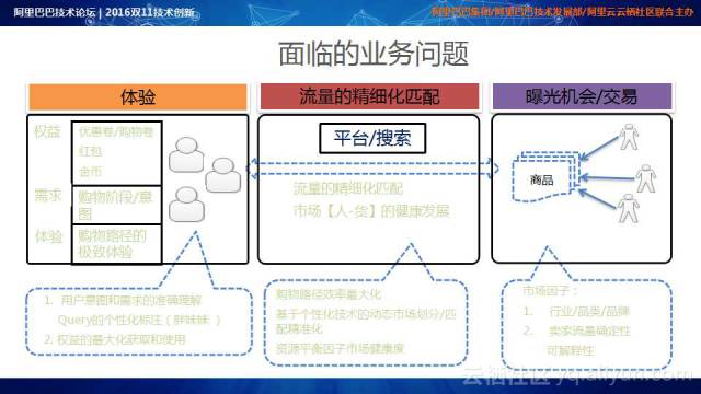 对于阿里巴巴电子商务平台而言,它涉及到了买家、卖家和平台三方的利益,因此必须最大化提升消费者体验;最大化提升卖家和平台的收益。在消费者权益中,涉及到了一些人工智能可以发力的课题,如购物券和红包的发放,根据用户的购物意图合理地控制发放速率和中奖概率,更好地刺激消费和提升购物体验;对于搜索,人工智能主要用于流量的精细化匹配以及在给定需求下实现最佳的人货匹配,以实现购物路径效率最大化。经过几年的努力,阿里研发了一套基于个性化技术的动态市场划分/匹配技术。