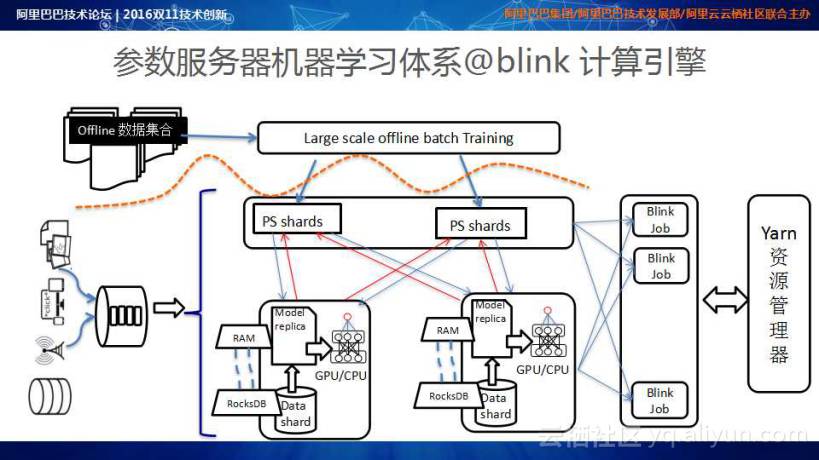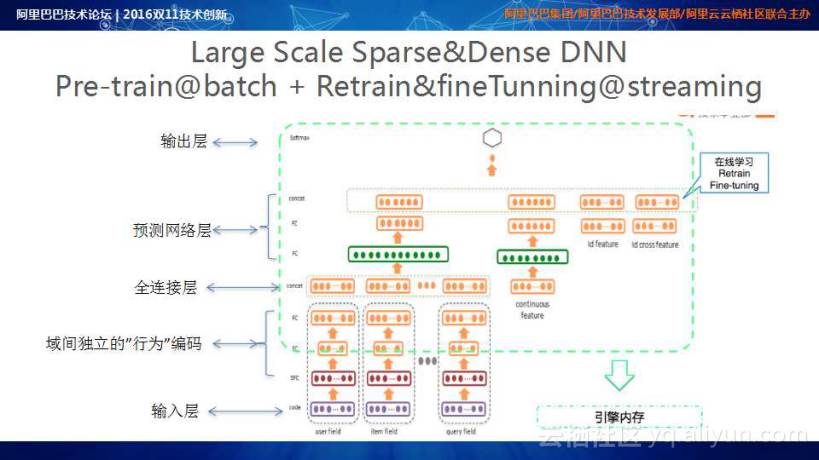 上图是基于Wide & Deep Learning for Recommender Systems的工作建立的Large Scale Sparse&Dense DNN训练体系的架构,该架构中利用Batch Learning进行Pre-Train,再加上Online数据的Retrain&fine Tuning。模型在双11当天完成一天五百万次的模型更新,这些模型会实时输送到在线服务引擎,完成Online的Prediction。