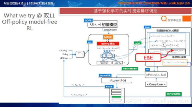 在双11采用的基于强化学习的实时搜索排序调控的实现体系如上图所示。当用户输入query时,会向系统询问哪一种排序策略最适合自己;该查询策略请求会上传至在线策略决策引擎,在线策略决策引擎通过实时学习的Q(s,a)模型合理选择有效策略,然后再返回给搜索引擎;搜索引擎依据当前状态下最有效策略执行搜索排序;在搜索排序页面展示的同时,系统会及时搜集相应的状态 action以及用户feedback的信号,并进入到Online Training Process;而Online Training Process会通过Off-policy model-free RL方法学习State To Action的映射关系,再从映射关系中得到线上排序所需要的策略参数;该策略参数由在线策略决策引擎通过Policy Invalid Process输出给在线搜索引擎。