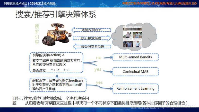 搜索和推荐过程可以抽象成一个序列决策问题,从消费者与引擎的交互过程中寻找每一个不同状态下的最优排序策略(各种排序因子的合理组合)。