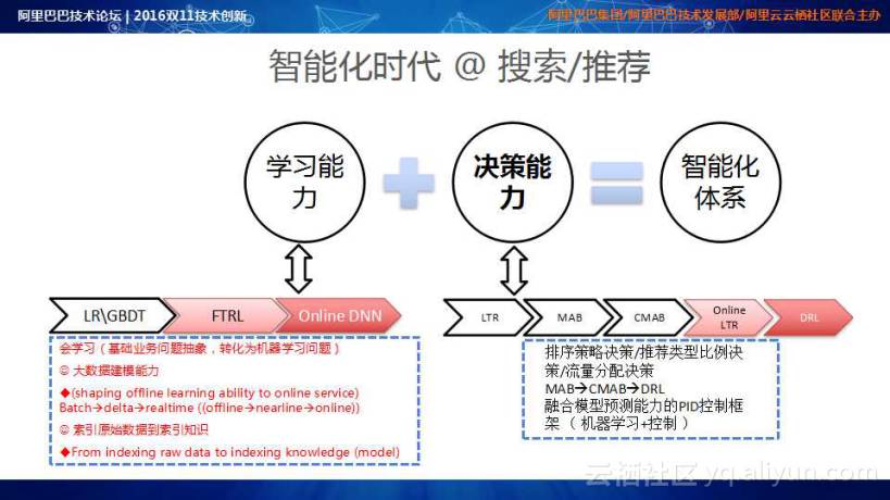智能化时代,对于搜索和推荐而言,可以提炼为两点:学习能力和决策能力。学习能力意味着搜索体系会学习、推荐平台具有很强的建模能力以及能够索引原始数据到索引知识提升,学习能力更多是捕捉样本特征空间与目标的相关性,最大化历史数据的效率。决策能力经历了从LTR到MAB再到CMAB再到DRL的演变过程,使得平台具备了学习能力和决策能力,形成了智能化体系。
