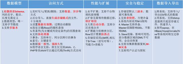 HBase的能力特点,可以简单概括为下表,基于这些能力,其被广泛应用于海量结构化数据在线访问、大数据实时计算、大对象存储等领域。